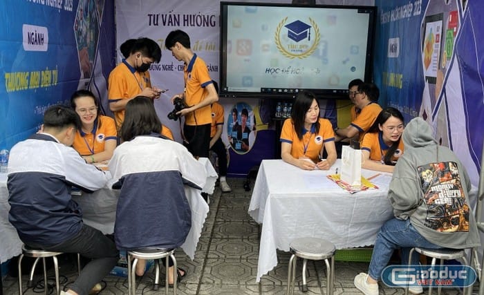 Nhân viên tuyển sinh Trường Trung cấp Thủ đô tư vấn chương trình học cho học sinh. Ảnh: NTCC